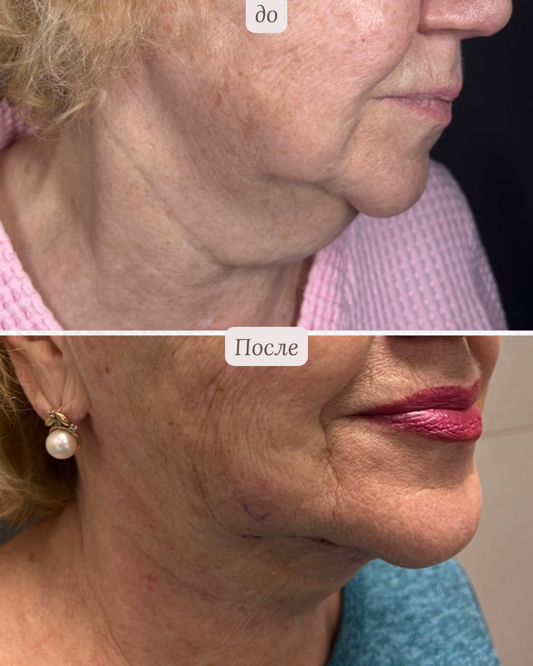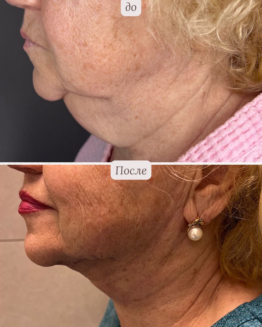 Точечная коррекция отдельных зон, работа с овалом, скулами, шеей и подбородком. Возвращаю чёткие контуры и молодость — без «натянутости» и потери индивидуальности.